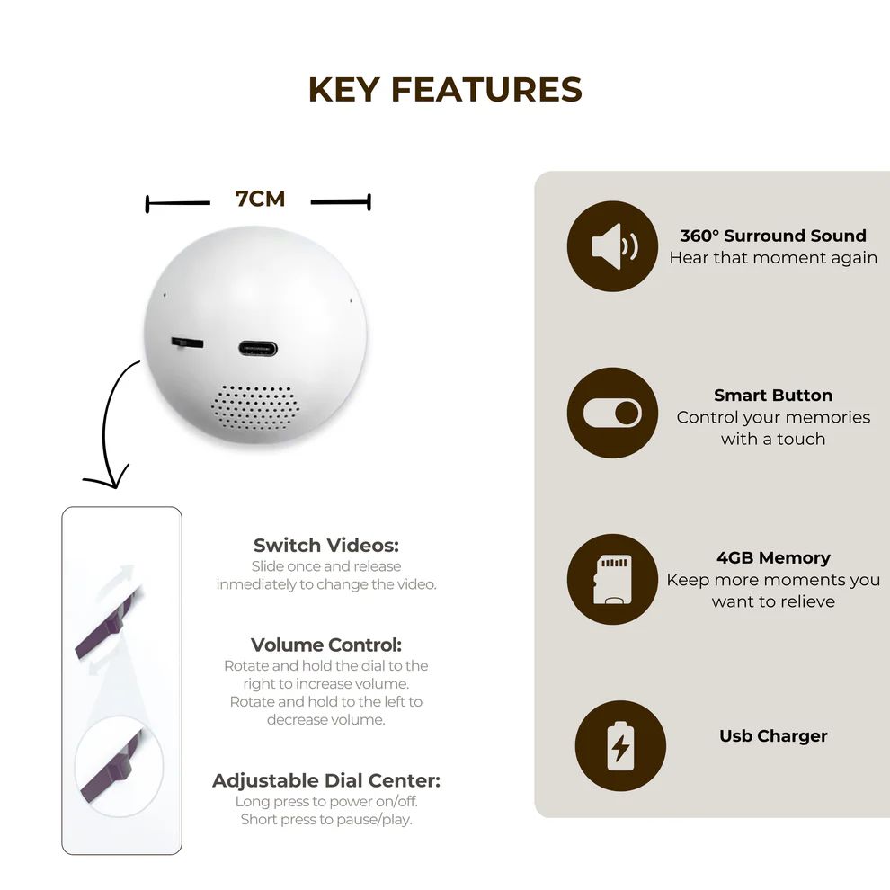 This 7cm compact device brings your memories to life with 360° sound, 4GB memory, and smart controls to easily switch, play, or pause. USB rechargeable and portable, it keeps your moments always close.